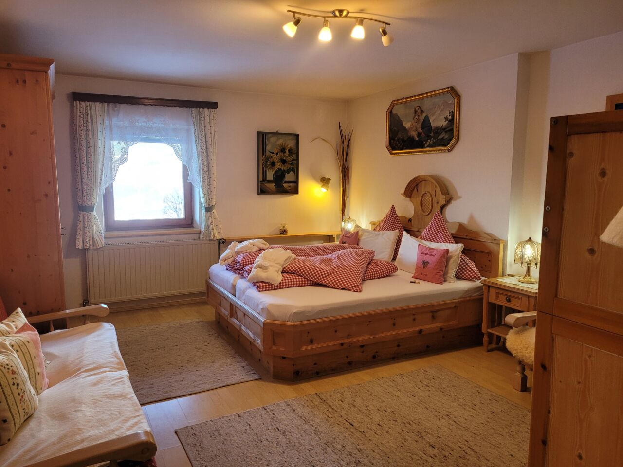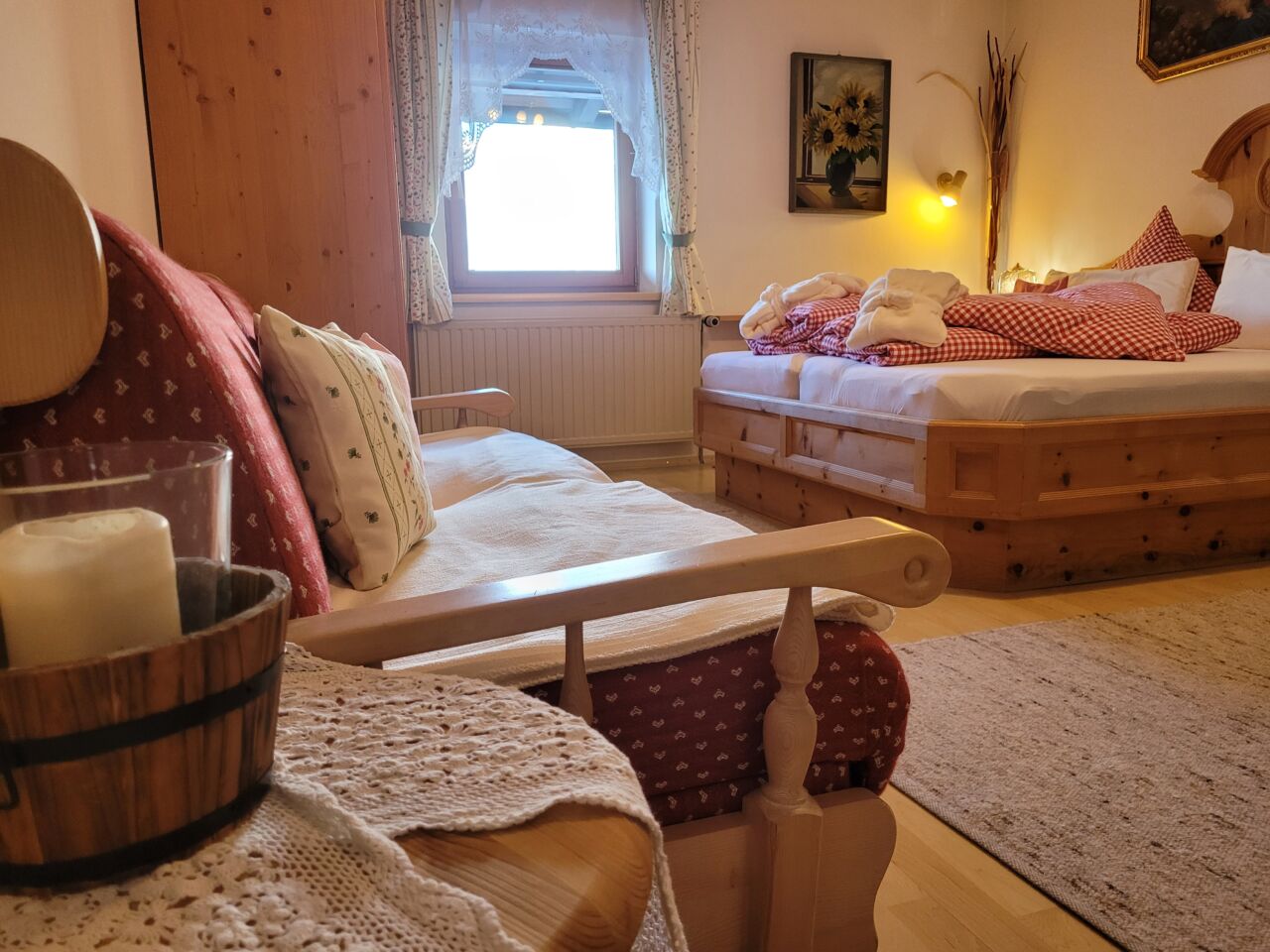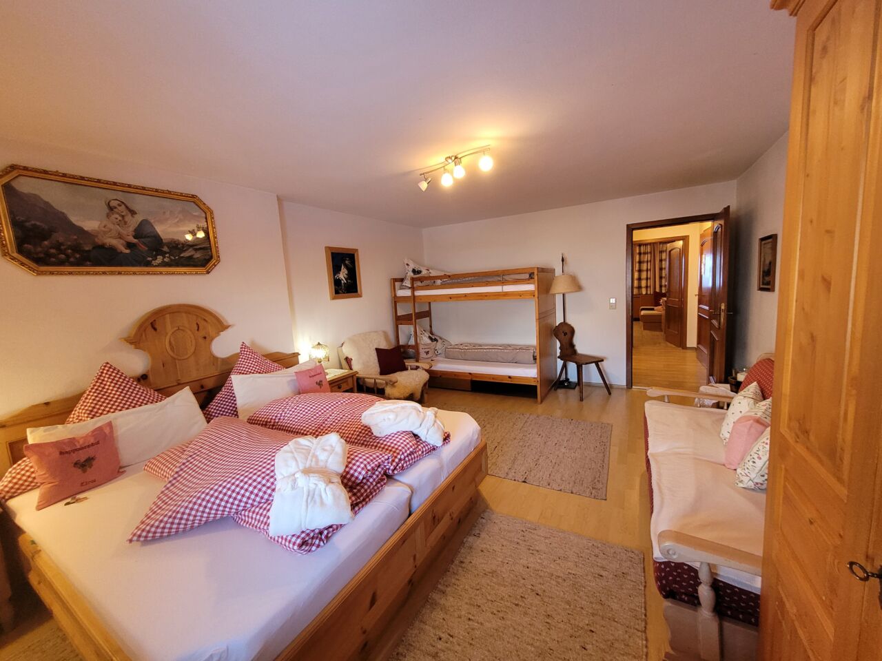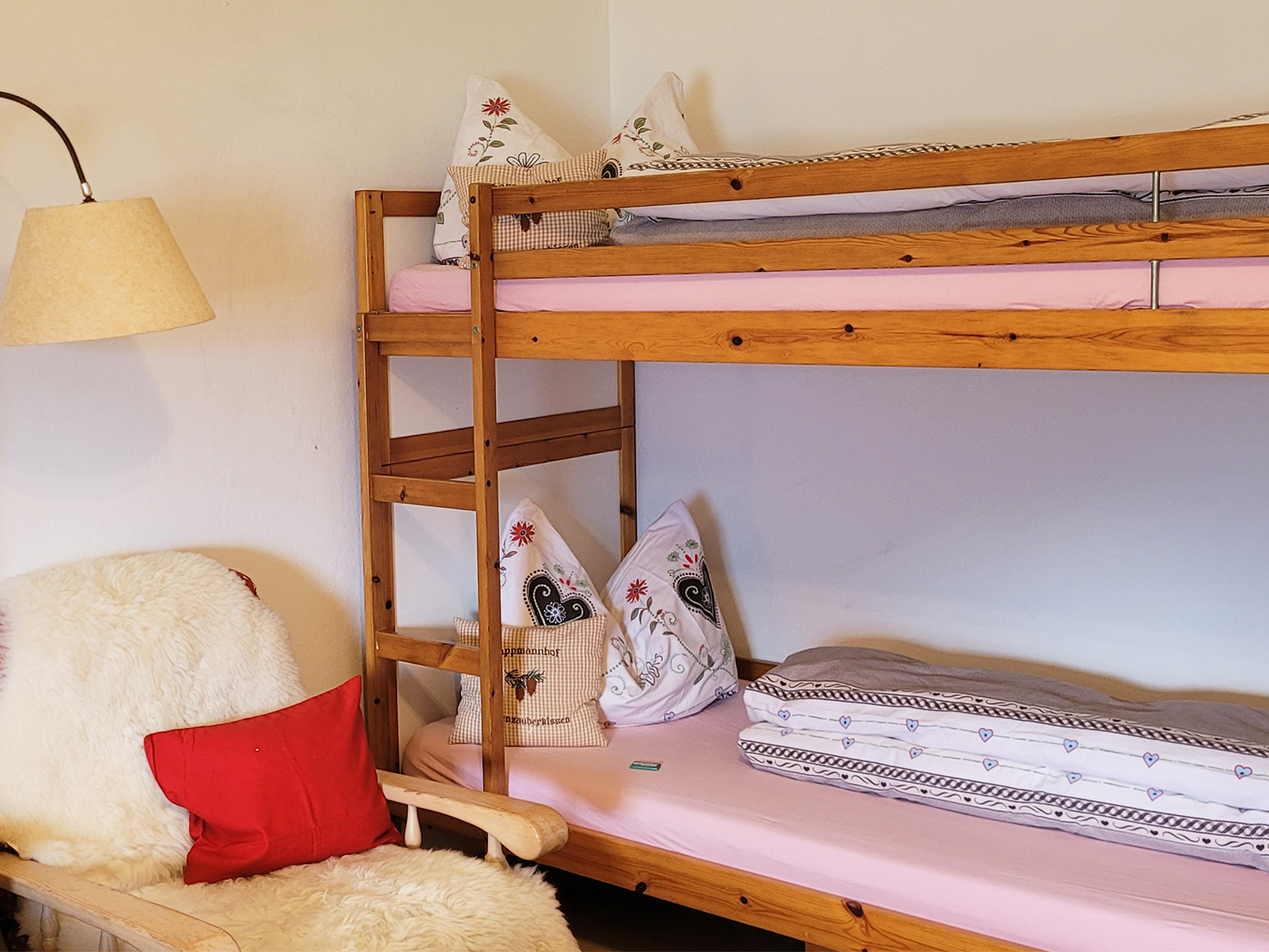 - Einem großen Schlafzimmer mit Zirbendoppelbett und Stockbett